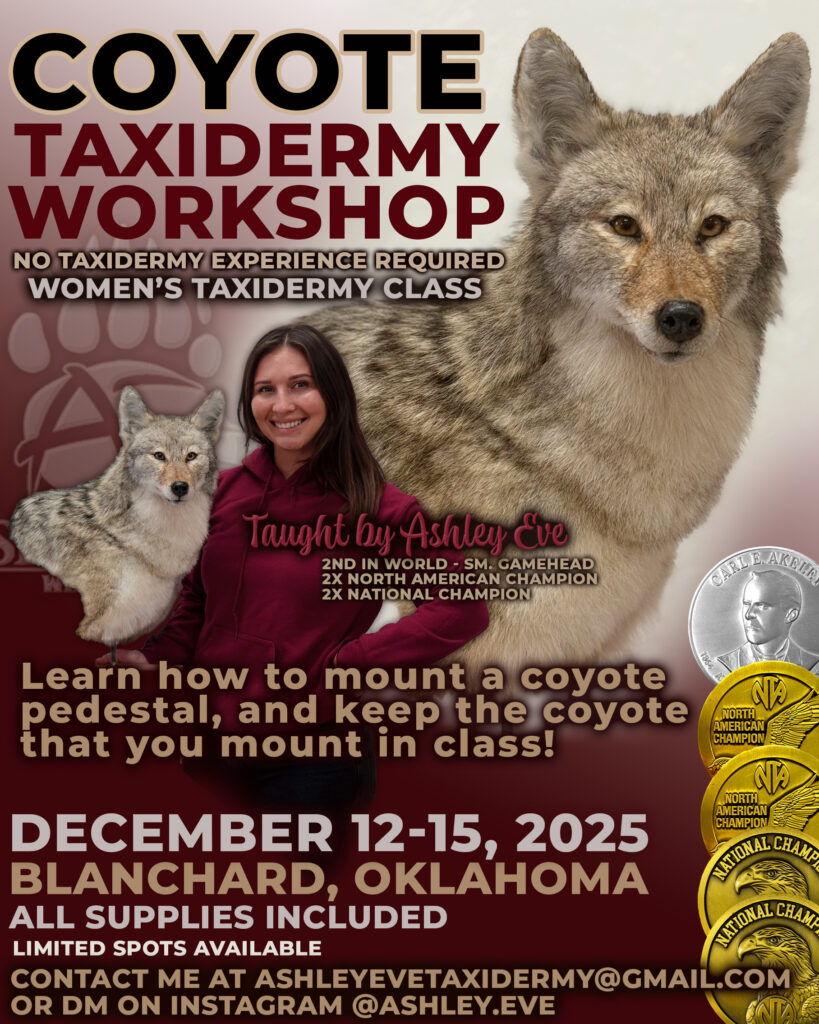 This class has limited spots available, and a small class size to ensure everyone has enough time and guidance to complete a beautiful coyote mount. That being said, it is a WOMEN’S ONLY class. As a woman myself (obviously lol) I’m passionate about other woman entering the taxidermy world and not being intimidated or discouraged to do so. There are numerous women’s hunting workshops, women’s rodeo clinics… so why not a women’s taxidermy class?